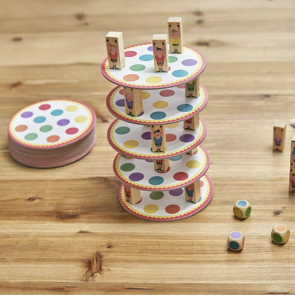 O hre: Zábavná spoločenská hra pre deti na zdokonalenie zručností je určená pre deti vo veku od 5 rokov, pre 2 - 8 hráčov. Hra je výborná pre všetkých, ktorí chcú potrénovať svoje strategické myslenie, motorické schopnosti a najmä sústredenie. Hádžte kocky a strategicky umiestnite svojich akrobatov tak, aby ste vytvorili čo najvyššiu vežu. Prvá osoba, ktorá zrazí vežu prehráva.